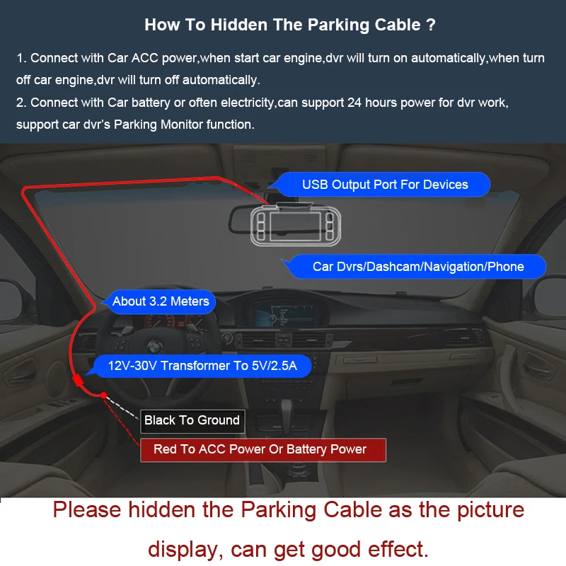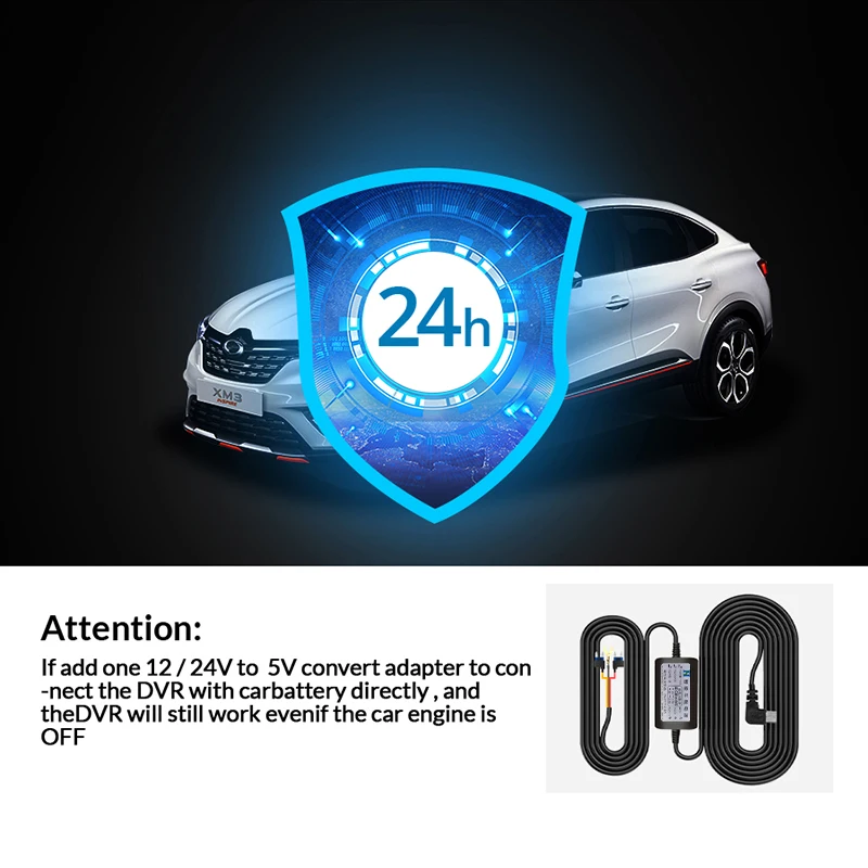 إذا كنت قلقًا بشأن تعرض سيارتك للتلف من قبل شخص آخر بعد ركن السيارة، فيمكنك استخدام خط باك الخاص بنا لتوصيل مسجل الفيديو الرقمي لضمان عمل المسجل لمدة 24 ساعة.إذا أذى شخص آخر سيارتك وأثارت الصدمة مستشعر G، فسيتم تشغيل مسجل الفيديو الرقمي على الفور وتسجيل الموقف.